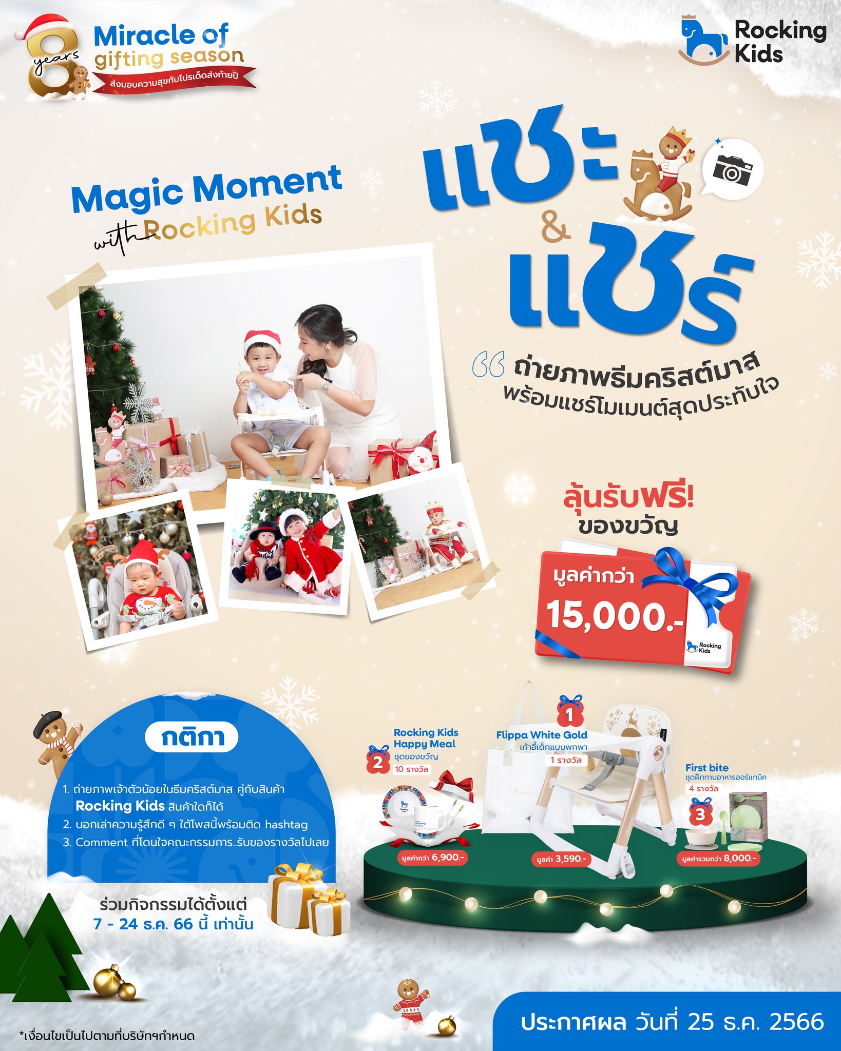 กิจกรรม แชะ&แชร์ ชวนคุณแม่มาเล่นกิจกรรมถ่ายภาพเล่าความประทับใจกับสินค้า Rocking kids เพื่อรับของขวัญสุดพรีเมียมมูลค่ากว่า 15,000 บาท สามารถร่วมกิจกรรมและศึกษารายละเอียดได้ที่ : คลิก