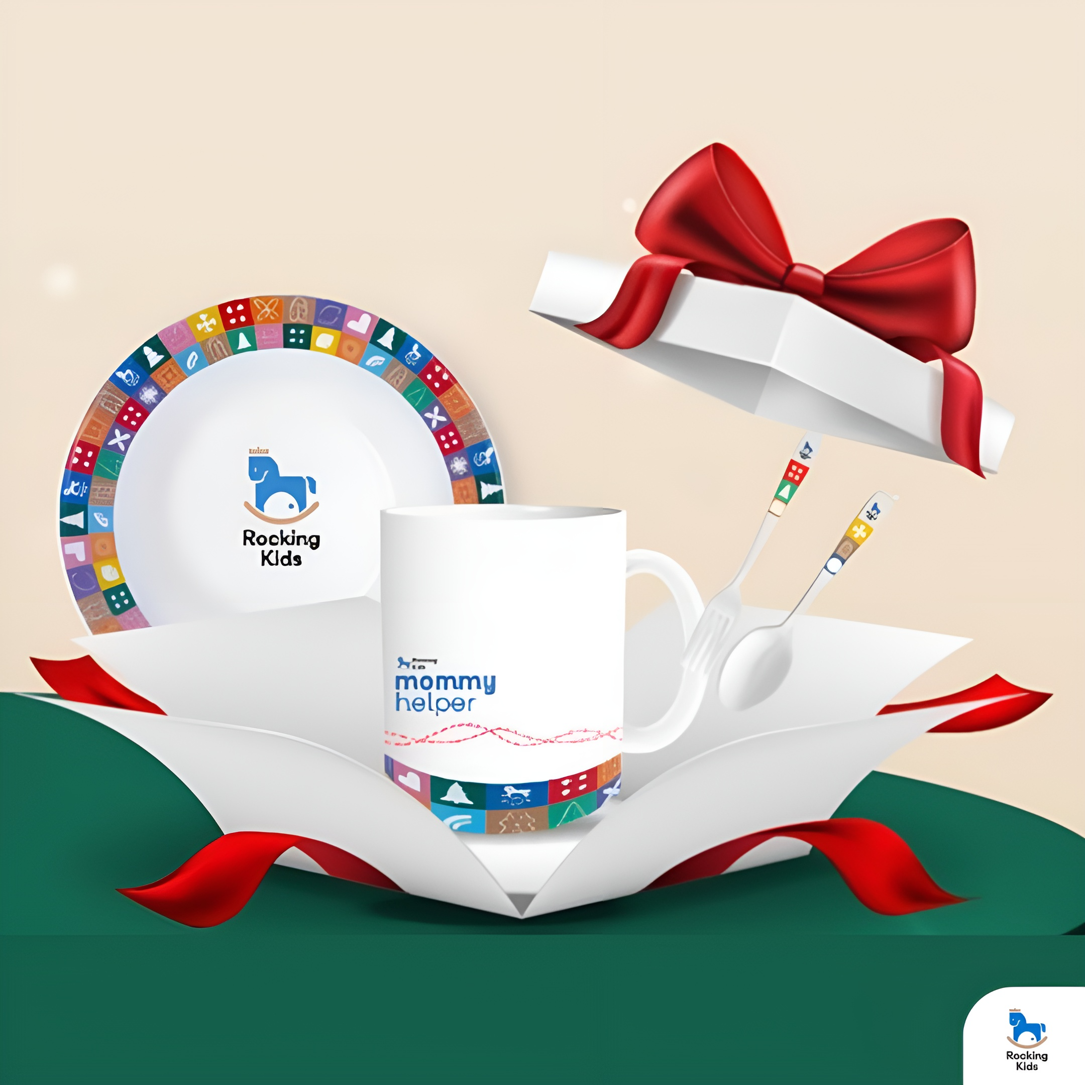 ชุดถ้วยชาม “Rocking kids happy meal” ที่ทีมงานร็อกกิงคิดส์ฯ ตั้งใจทำเพื่อมอบให้เป็นของขวัญสุดพิเศษในช่วงเทศกาลส่งท้ายปีนี้เท่านั้น ภายในเซตประกอบไปด้วย ถ้วย แก้วน้ำ และชุดช้อนส้อม