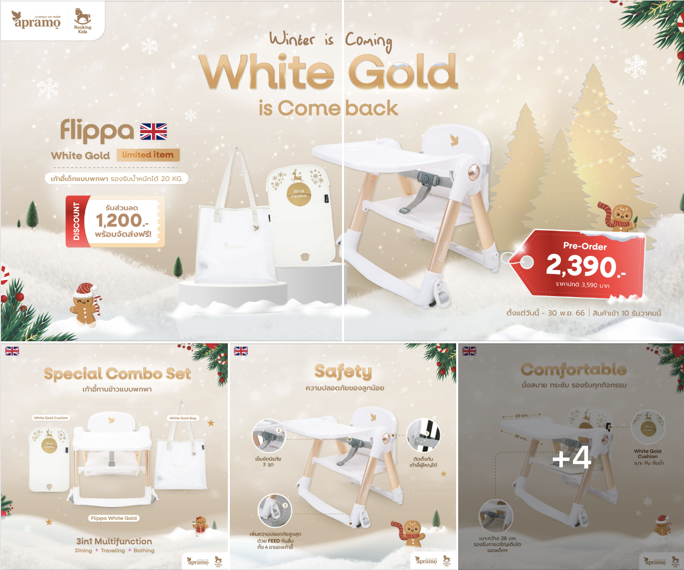 รวมถึง กิจกรรมเปิดตัวอย่างยิ่งใหญ่กับการกลับมาอีกครั้งของเก้าอี้ยอดฮิตจาก Apramo Flippa รุ่น White gold ที่แม่ ๆ ทั่วประเทศตามหา โดยทุกกิจกรรมเราตั้งใจที่อยากจะมอบเป็นของขวัญและความรู้สึกดี ๆ ให้กับพ่อ ๆ แม่ ๆ ทั่วทั้งประเทศ