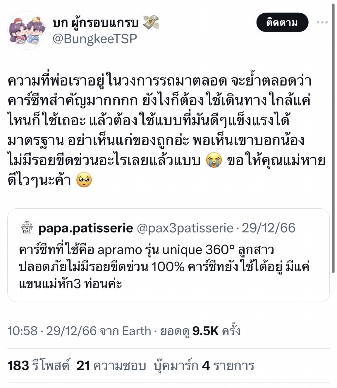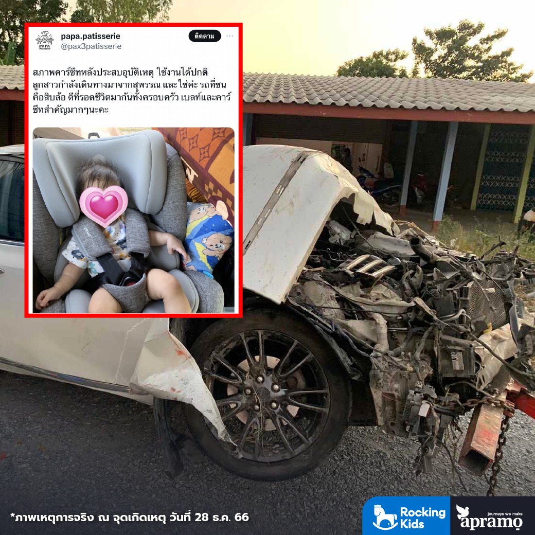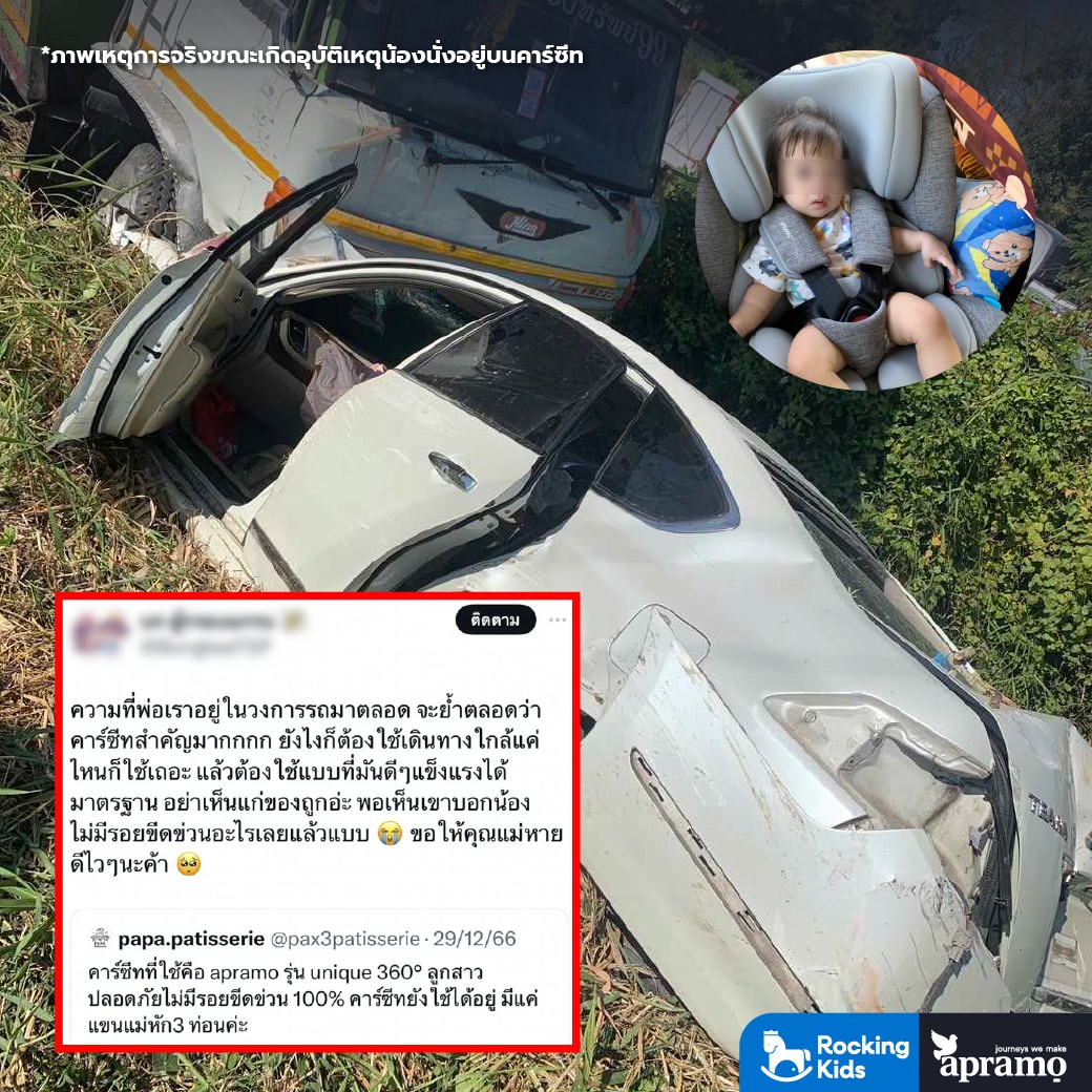 @Papa.patisserie “คาร์ซีทที่ใช้คือ Apramo รุ่น unique 360° ลูกสาวปลอดภัยไม่มีรอยขีดข่วน 100% คาร์ซีทยังใช้ได้อยู่ มีแค่แขนแม่หัก3 ท่อนค่ะ” และยังบอกต่ออีกว่า ควรเลือกคาร์ซีทที่ได้มาตรฐานสากลและเชื่อถือได้นอกจากนี้ก็ยังมีผู้ปกครองมากมายที่ออกมาเผยว่าก็ใช้คาร์ซีทรุ่นนี้เช่นกัน เป็นการเพิ่มความมั่นใจในความปลอดภัยให้กับผู้ปกครองที่มาอ่านต่อ