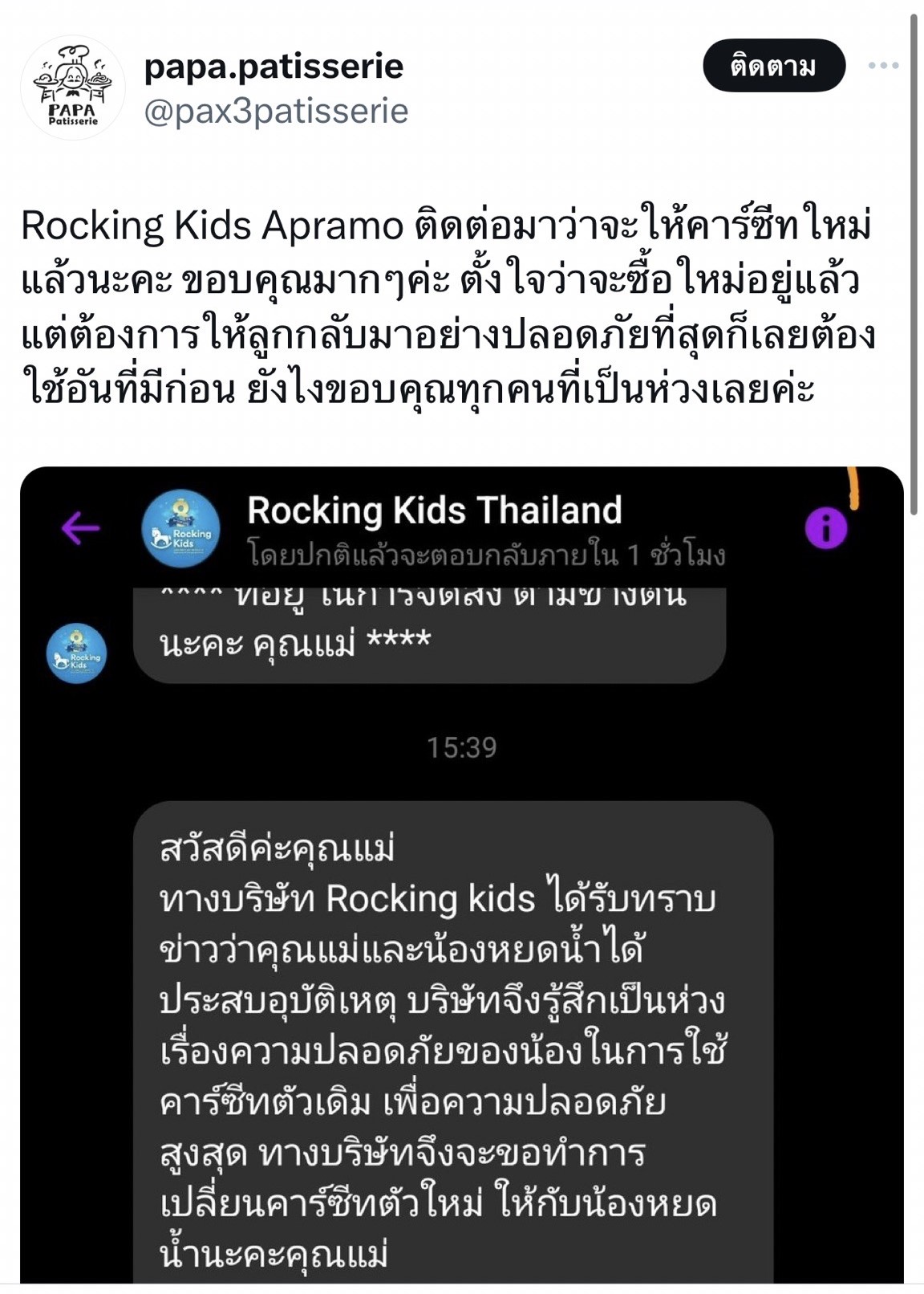 เมื่อทราบข่าวร็อคกิงคิดส์ฯ จึงรู้สึกเป็นห่วงความปลอดภัยของน้องหยดน้ำในการใช้คาร์ซีทตัวเดิม และ เล็งเห็นถึงความสำคัญของคุณแม่และน้องหยดน้ำเป็นอันดับแรก รวมถึงความปลอดภัยในการใช้คาร์ซีทตัวเดิมหลังจากการเกิดอุบัติเหตุ จึงทำการส่งเปลี่ยนคาร์ซีทตัวใหม่ให้คุณแม่ภายใน 5 วัน ตามนโยบายของบริษัท ที่ไม่สนับสนุนการใช้คาร์ซีทที่ผ่านการเกิดอุบัติเหตุมาแล้ว