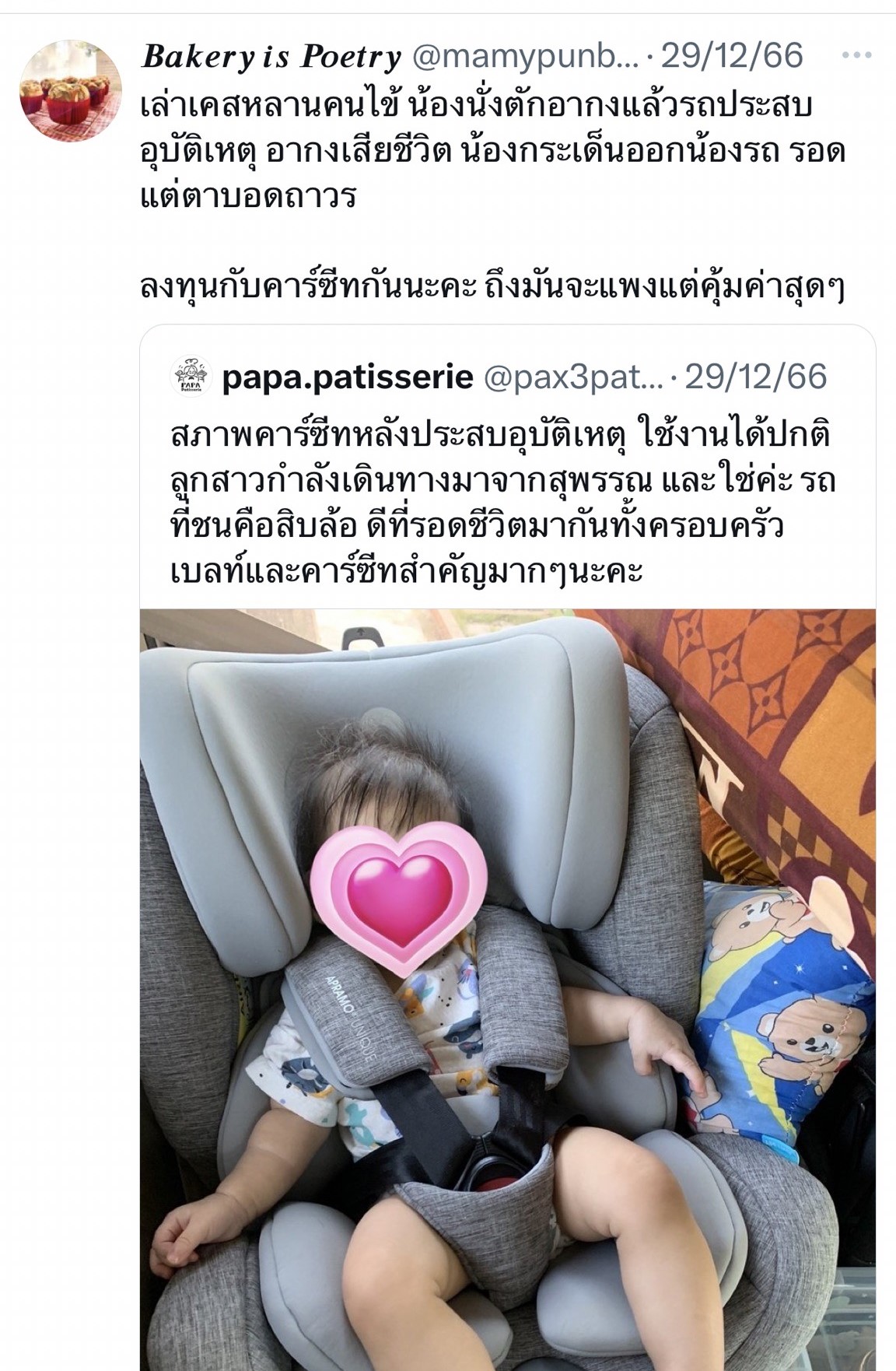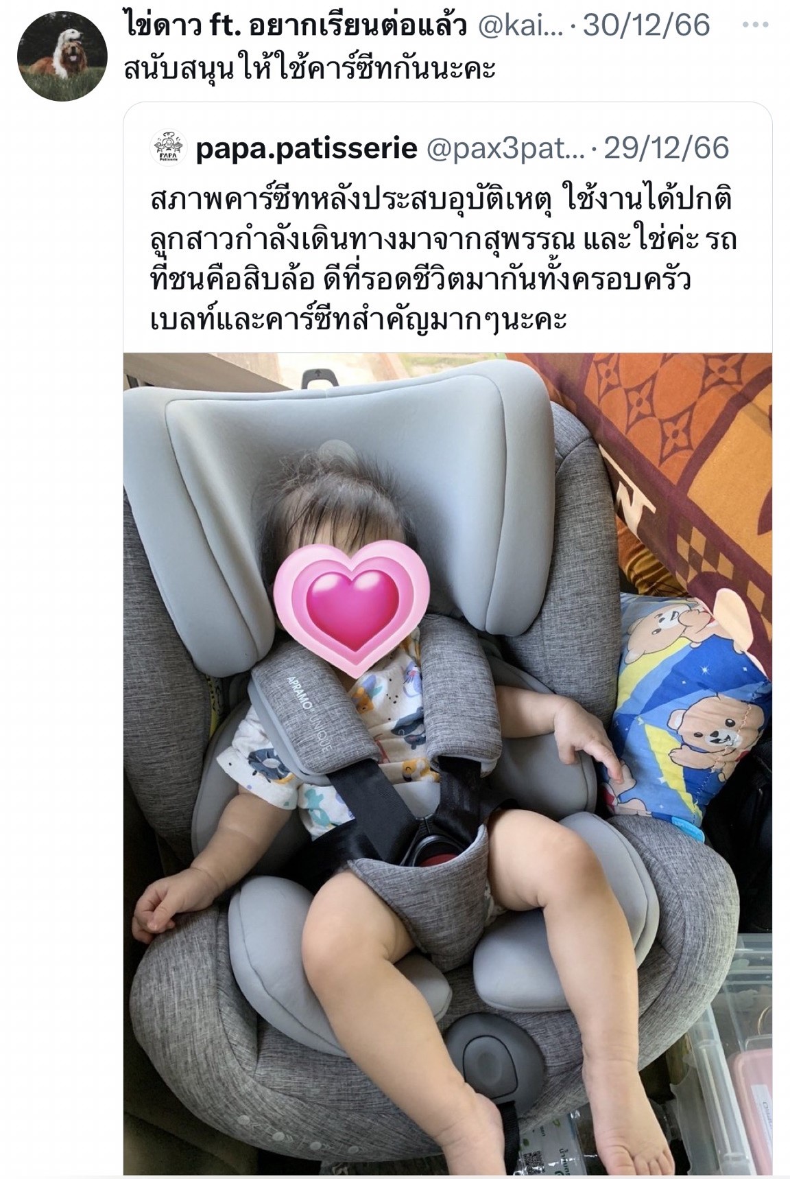 @Papa.patisserie “สภาพคาร์ซีทหลังประสบอุบัติเหตุ ใช้งานได้ปกติ ลูกสาวกำลังเดินทางมาจากสุพรรณ และใช่ค่ะ รถที่ชนคือสิบล้อ ดีที่รอดชีวิตมากันทั้งครอบครัว เบลท์และคาร์ซีทสำคัญมาก ๆ นะคะ”