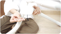 3. ผูกเชือกจากเบาะเข้ากับตัวเก้าอี้ ด้วยการพับแผ่นเบาะประมาณ 1 นิ้ว จากนั้นสอดเชือกเข้ารูเก้าอี้ และเกี่ยวเข้ากับตะขอใต้เก้าอี้