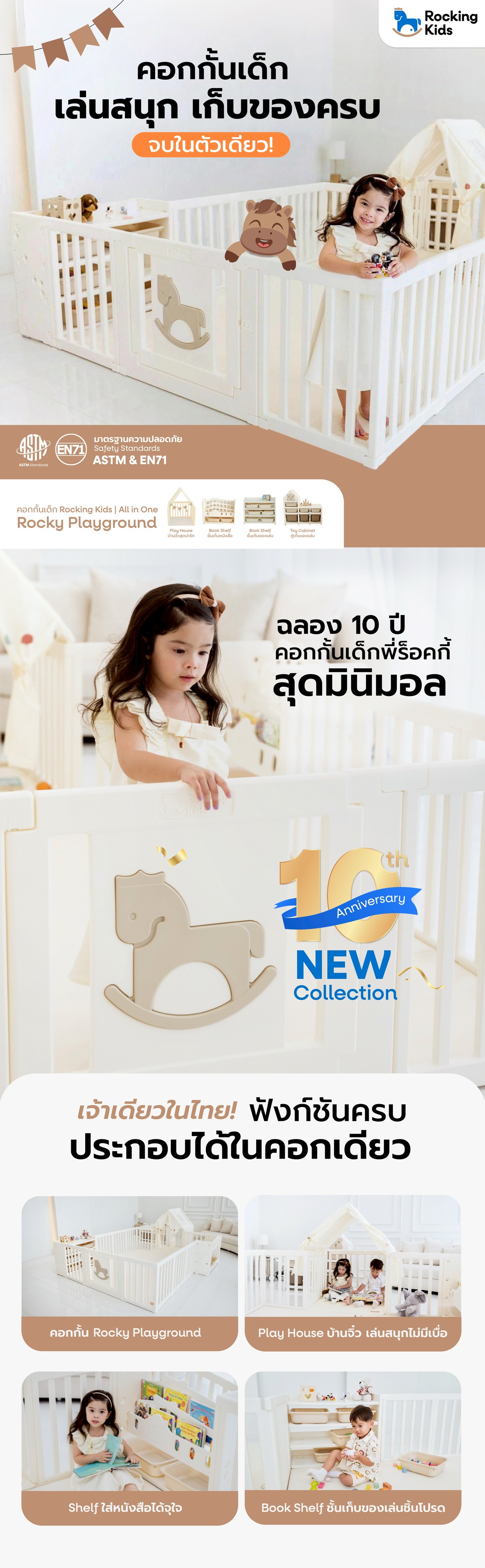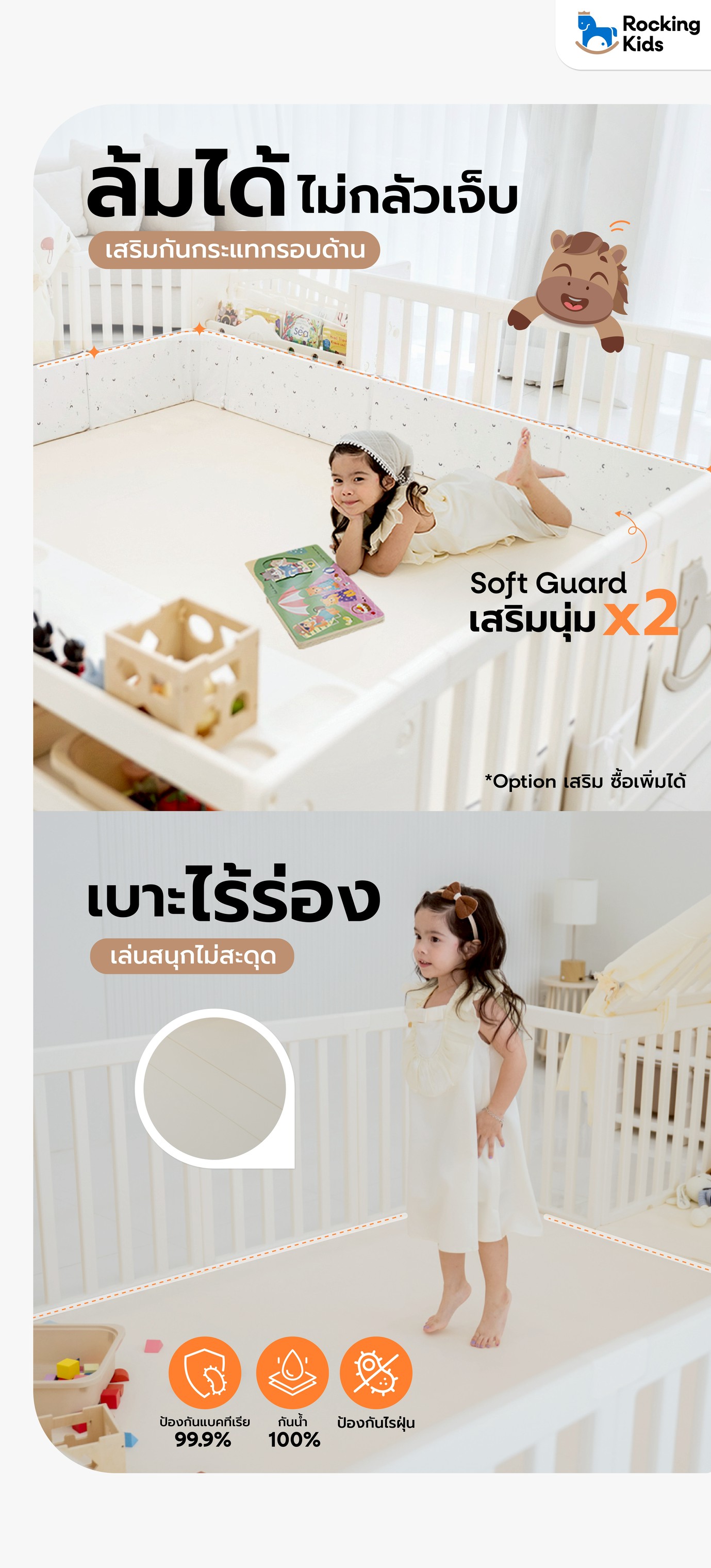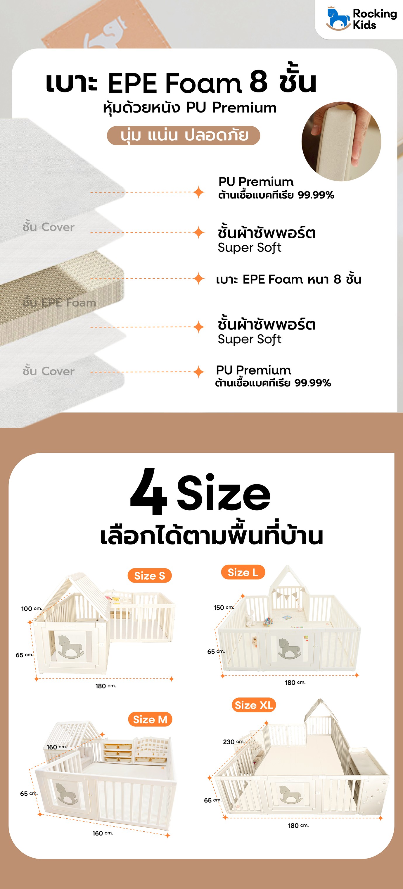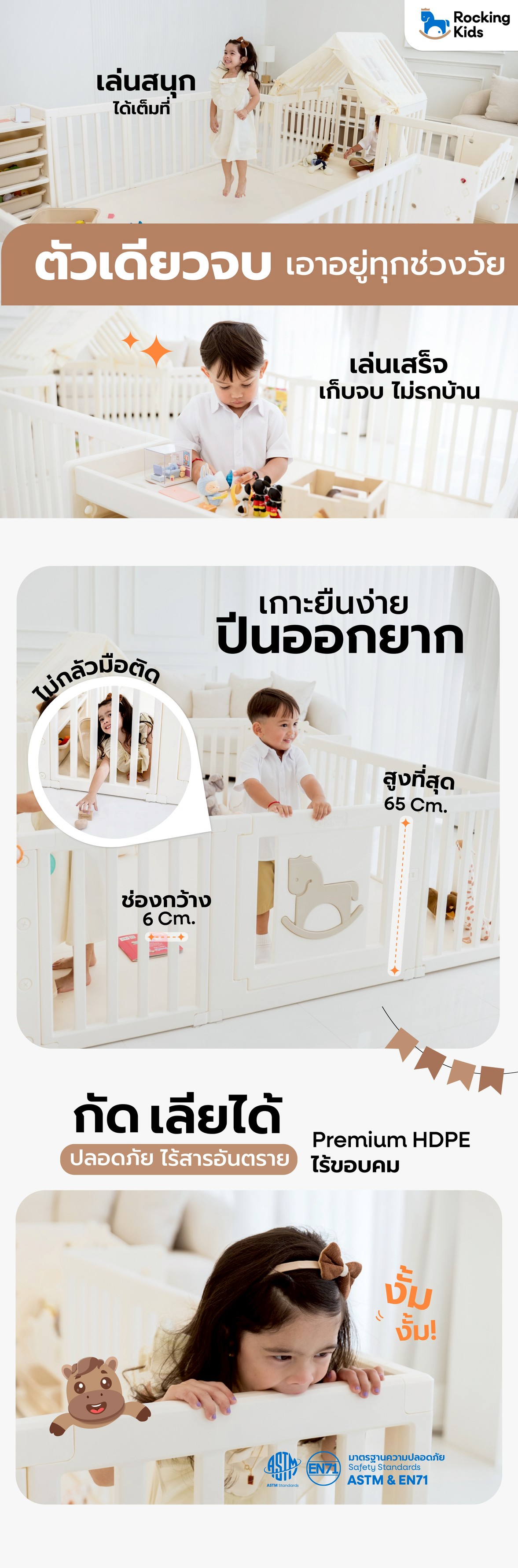 "Rocking Kids Playground" คอกกั้นเด็กที่ออกแบบมาเพื่อตอบโจทย์ไลฟ์สไตล์คุณแม่ยุคใหม่ สร้างพื้นที่ปลอดภัย และสนุกสนานให้ลูกน้อยได้เล่นอย่างเพลิดเพลิน พร้อมเสริมสร้างพัฒนาการทุกช่วงวัย ด้วยวัสดุพรีเมียมมาตรฐานระดับสากล และเบาะไร้ร่อง Anti bateria 99% ปรับเปลี่ยนฟังก์ชันได้ตามใจ ให้ลูกมีพื้นที่ส่วนตัวที่อบอุ่น ปลอดภัย เล่นได้ไม่มีเบื่อ