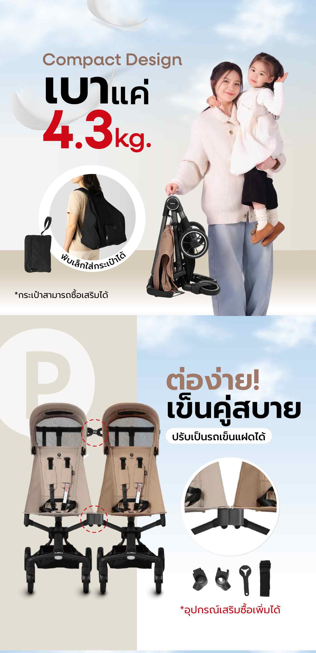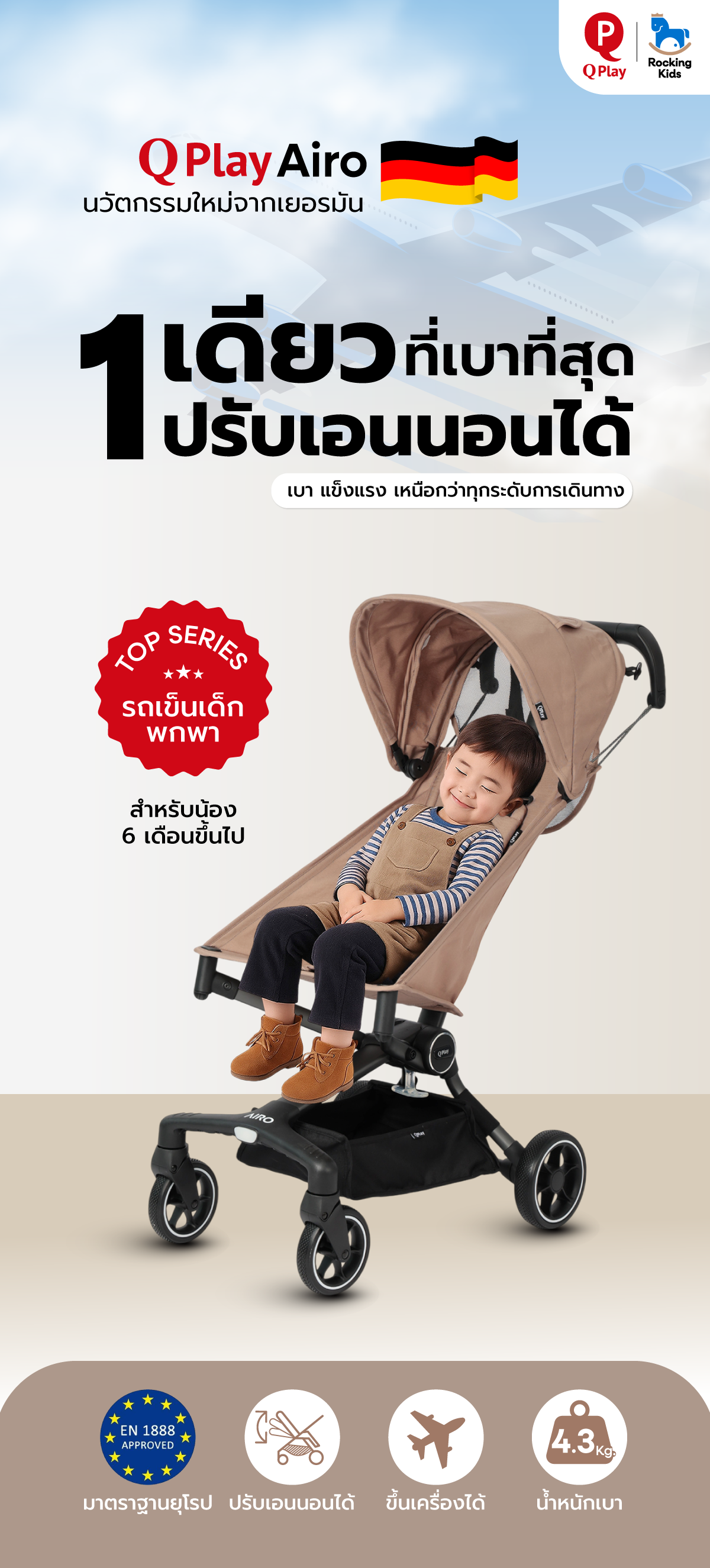รถเข็นเด็กพกพา Qplay Airo รถเข็นเด็กโต พับเล็ก ขึ้นเครื่องบินได้ น้ำหนักเบา เพียง 4.3 Kg. สำหรับเด็ก 6 เดือนขึ้นไป